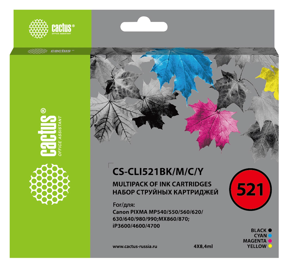 Картридж струйный Cactus CS-CLI521BK/M/C/Y черный/голубой/желтый/пурпурный набор (33.6мл) для Canon