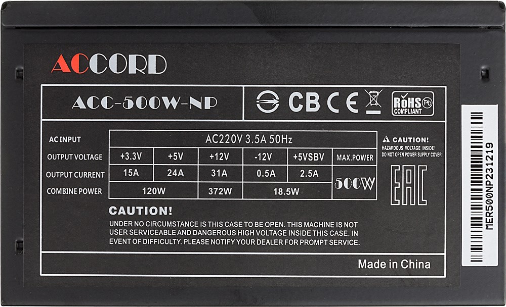 Блок питания Accord ATX 500W ACC-500W-NP (20+4pin) 120mm fan 4xSATA