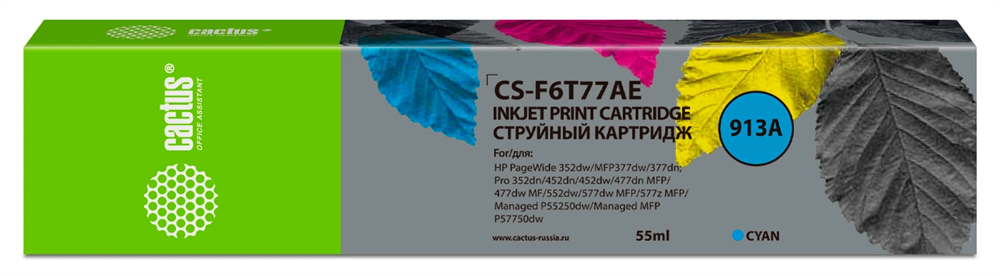 Картридж струйный Cactus CS-F6T77AE 913A голуб.пигм. (55мл) для HP PW 352dw/377dw/Pro 477dw/452dw с